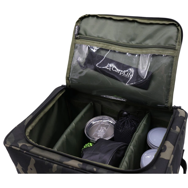 A Tardis of a bag manufactured with upgraded 900D Oxford Camo fabric. Reinforced CarpLife Zips inside and out. Clear inner pocket for extra storage of sachets etc.