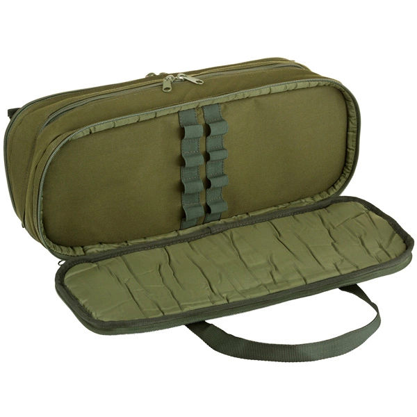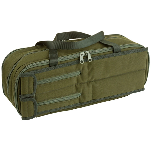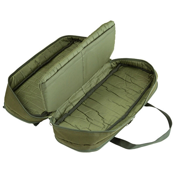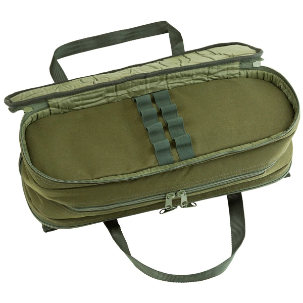 - Two further fully padded sections are designed to house single banksticks, either with or without alarms fitted. Both have full zip access and feature elasticated loops to hold banksticks in position.