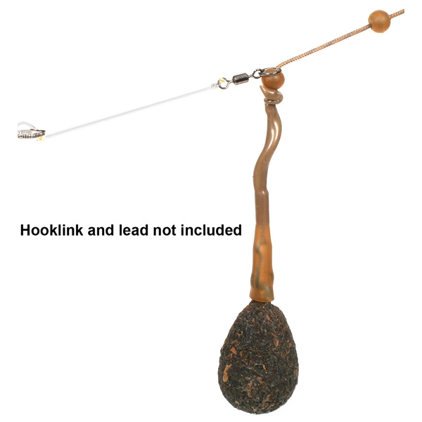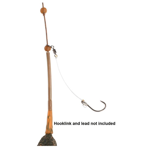 In the interest of fish safety, the upper bead is always mounted on a short section of silicone tube. Once disengaged from the tube this large bore bead and the rig are free to pass over the leader knot. The chod rig sleeve not only prevents the hook point from coming into contact with the lead and masks the clip link but also compresses when playing fish and acts as an effective shock absorbing buffer.