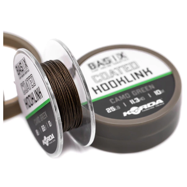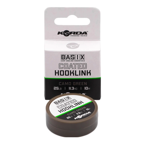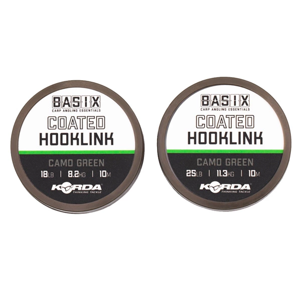 The BASIX Coated Hooklink is a soft, supple coated braid material that lends itself to all sorts of different presentations for bottom baits, wafters and pop-ups. Both the inner braid and outer coating are a subtle ‘camo green’ colour to help ensure that it will blend in with whatever type of lakebed you are fishing over. It will lay straight without the need for steaming and has great anti-tangle properties, plus the coating can easily be stripped back where required to create a hinge and give your rigs extra movement. It knots very well without breaking the outer coating, and good strength can be achieved with any conventional fishing knot. Available in 18lb or 25lb. 10m spool.