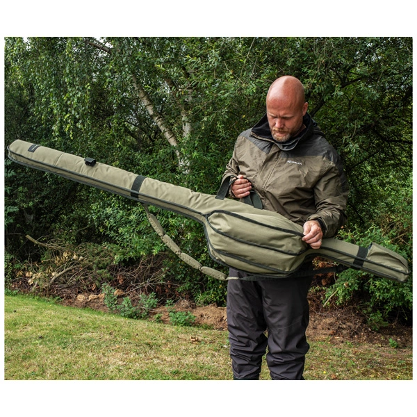 This simple 3 Rod Sling houses three made-up 12ft rods easily. Includes outer quiver area for extra rods or landing net handles. Unique combination of materials that make the luggage lighter, tougher and more waterproof than ever. Padded carrying handle and shoulder strap. Outer pocket and straps for extra rods or landing net handles.