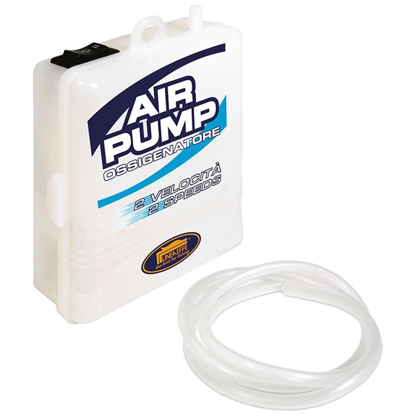 Two speed battery operated air pump. Supplied with tube, stone amd metallic belt hanger. Powered by 1 x D (not included – see product code 22469).