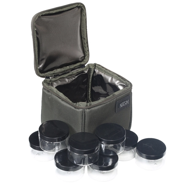 Tough, insulated and padded pouches containing screw top hookbait pots and space to spare. 8 pot capacity.