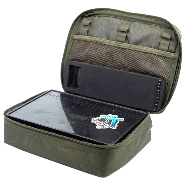 Main compartment fits Box Logic Medium tackle box (not included). Integral under lid compact rig board with pins, capacity approx. 10 rigs. Six under lid elastic loops for baiting needles and tools and six elastic mesh pockets for TT packets.