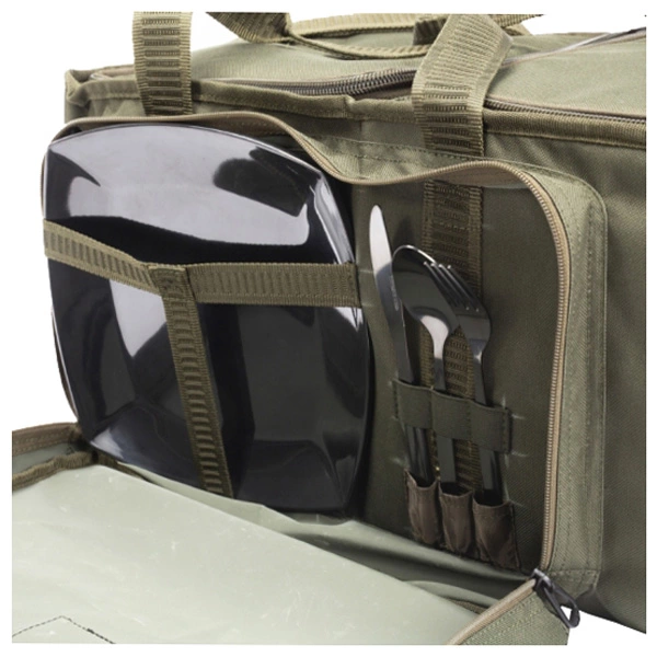 Improved and updated with a generous insulated main compartment to keep food fresh. Front compartment contains luxury black heat resistant plate, black stainless Knife, Fork, Dessert Spoon.