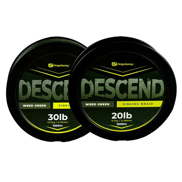 RidgeMonkey’s original braided main line was highly popular with anglers and has now been improved. Descend is a super-fast sinking braid thanks to the round profile and low diameter it offers. Ideal for use as a main line when fishing at distance and well-equipped to cope with the rigours of even the toughest of conditions. Superior abrasion resistance while offering virtually zero stretch. Available in 20lb/9.1kg/0.28mm and 30lb/13.6kg/0.35mm. 1000m Spool.