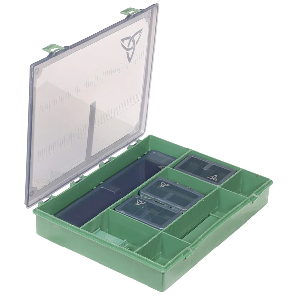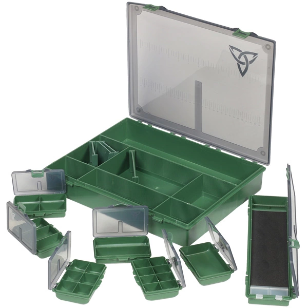 Includes main box – Dimensions – 36 x 28 x 6cm, 1 x Stiff Rig Box, 1 x One Compartment Box, 1 x Two Compartment Box, 1 x Three Compartment Box, 1 x Four Compartment Box, 1 x Five Compartment Box and 1 x Six Compartment Box and Three Small and One Large removeable divider.